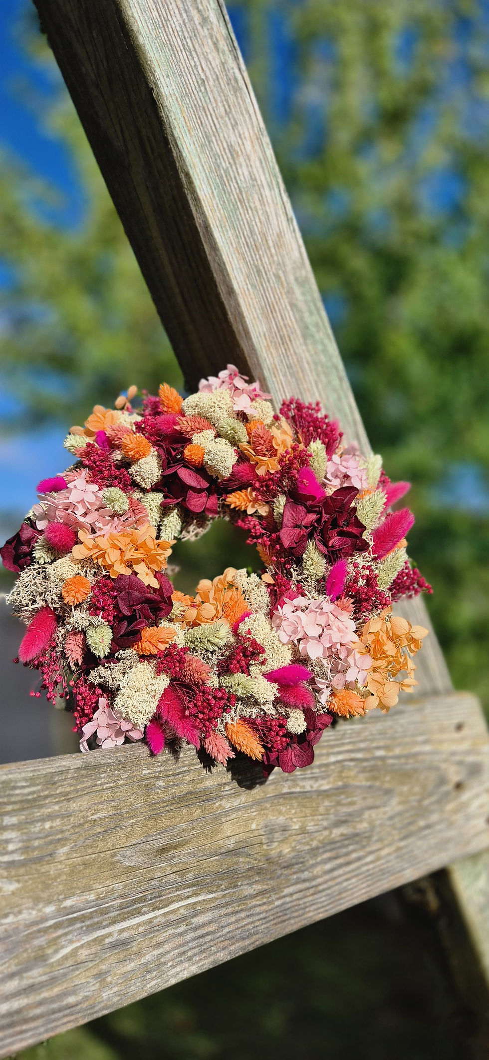 Farbenfroher handgefertigter Tischkranz aus Trockenblumen